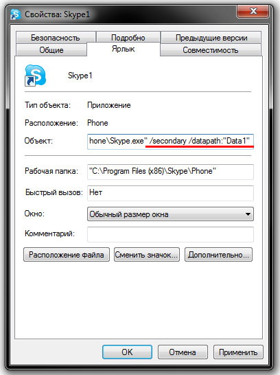 «C:Program Files (x86)SkypePhoneSkype.exe» /secondary /datapath:»Data1″(в случае если у Вас 64-битная система)