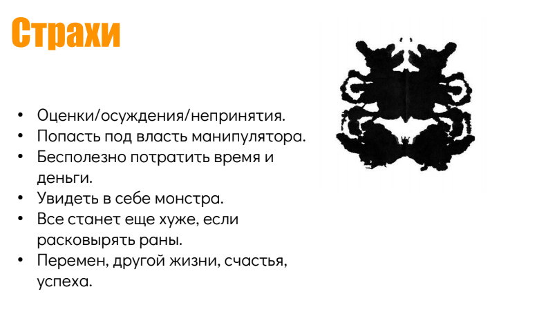 Страх оценки / осуждения / непринятия. Расскажите о своём отношении к клиентам: ваша задача не оценивать или обесценивать и осуждать, а помочь человеку.