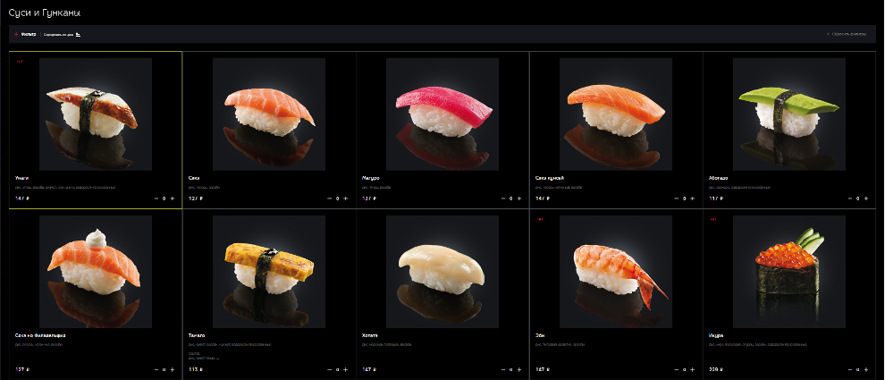 Отдельного внимания заслуживают сеты, куда входят наборы с роллами, бенто-ланчи и детское меню. Если вам нравятся блюда с конкретным ингредиентом (например, тунец или лосось),то вы сможете быстро перейти в раздел, где будут находиться все блюда с нужными вам компонентами. Для этого выберите в меню пункт «Ингредиенты».