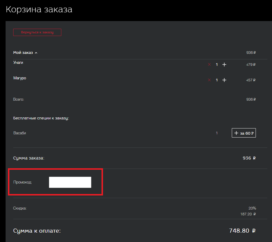 Применение промокода на доставку суши и ролов