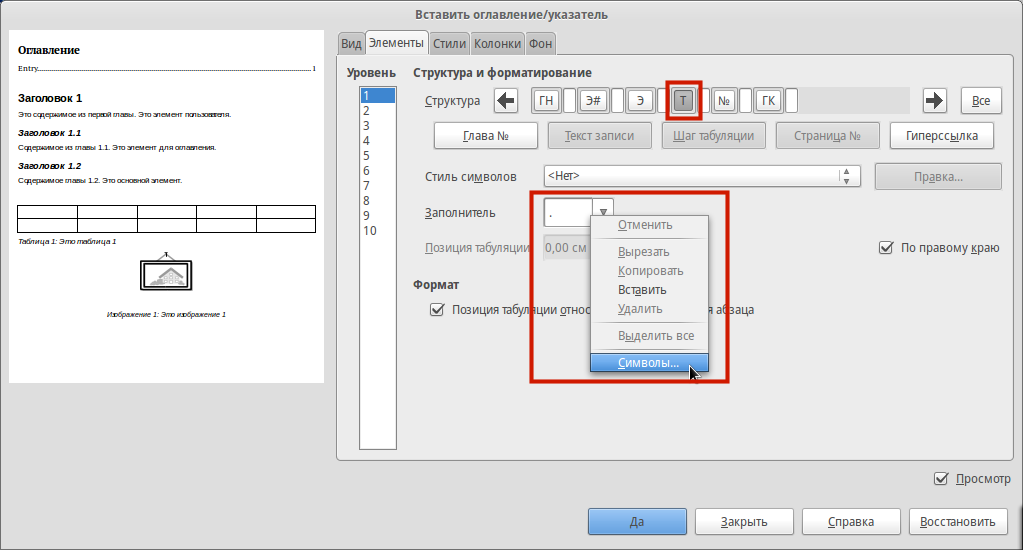 Кнопка «Т» ― шаг табуляции, позволяет настроить расстояние и параметры заполнителя между названием и номером страницы. С помощью выпадающего списка при нажатии правой кнопкой мыши на поле «Заполнитель» можно выбрать любой символ для заполнения.