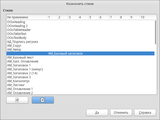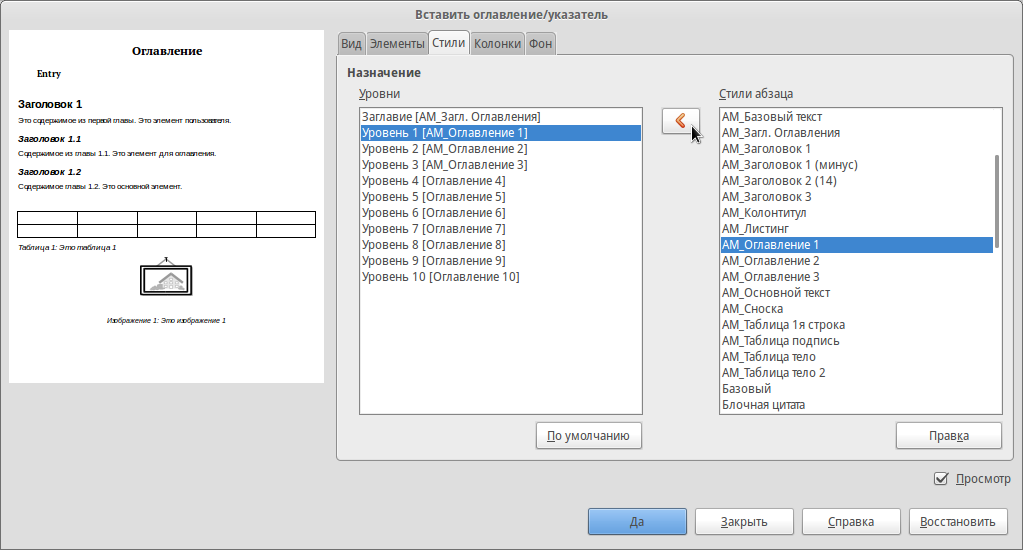 В списке «Уровни» выберите уровень, в списке «Стили абзаца» выберите стиль для присвоения. Присвойте требуемый стиль уровню с помощью кнопки со стрелкой в центре между списками. При необходимости можно вызвать окно редактора параметров стиля, нажав на кнопку «Правка».