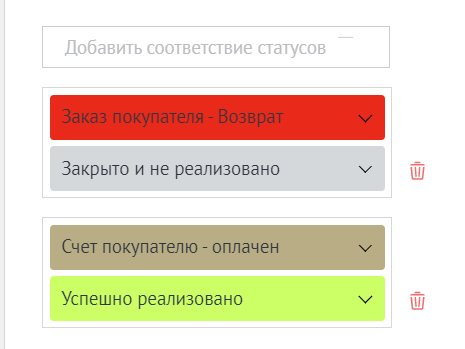 Для синхронизации статусов документов Заказа, Счета, Отгрузки в МойСклад и этапа Сделки в amoCRM в настройках виджета необходимо указать соответствие статусов.