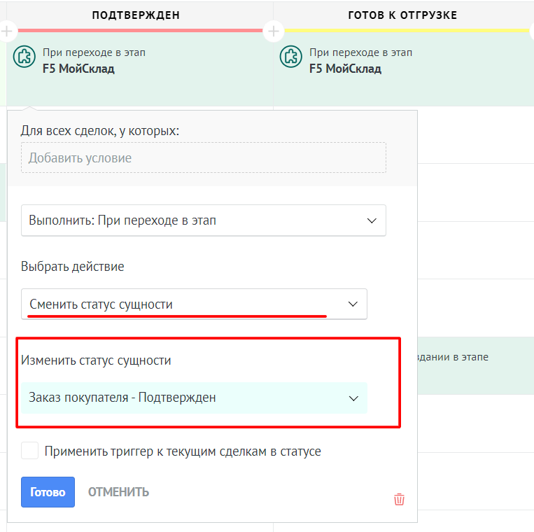 Пример на скрине — при переходе Сделки на этап «Подтвержден» в МойСклад статус Заказа сменится на «Подтвержден».