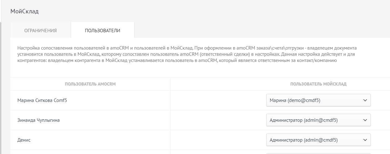 Для пользователя amoCRM укажите соответствующего ему пользователя МойСклад и сохраните настройки. Все документы, создаваемые пользователями через виджет, в МойСклад будут создаваться от соответствующих им пользователей.