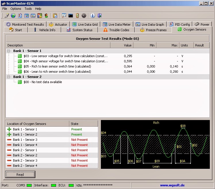 Режим 5 : с читывание и просмотр результатов теста датчиков кислорода (Mode 5 O2 Sensor Monitoring Test Result).