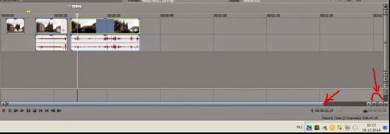 Для начала обрежем только те части видео, которые нам не нужны, например, отрезок с 15 по 40 секунд нам совершенно не нужен. Тогда мы встаем на пятнадцатую секунду дорожки, нажав в нужном месте на таймлайне (на видеосюжете). Если промахнулись, то можно подвинуться на нужное время с помощью стрелок на клавиатуре.