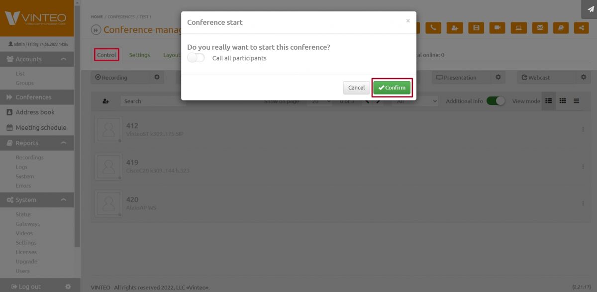 Click the «Off» button in the «Control» tab to start the conference. In the start-up confirmation dialogue, press the «Confirm» button.