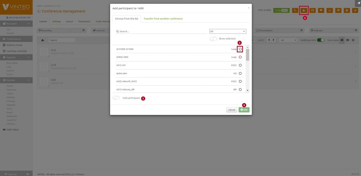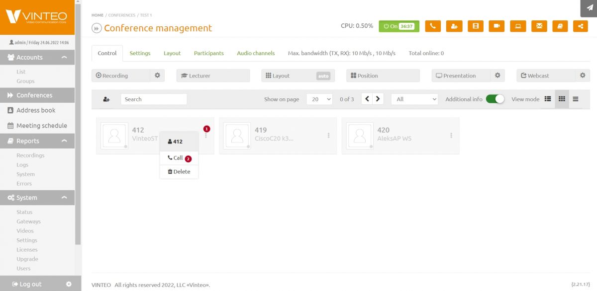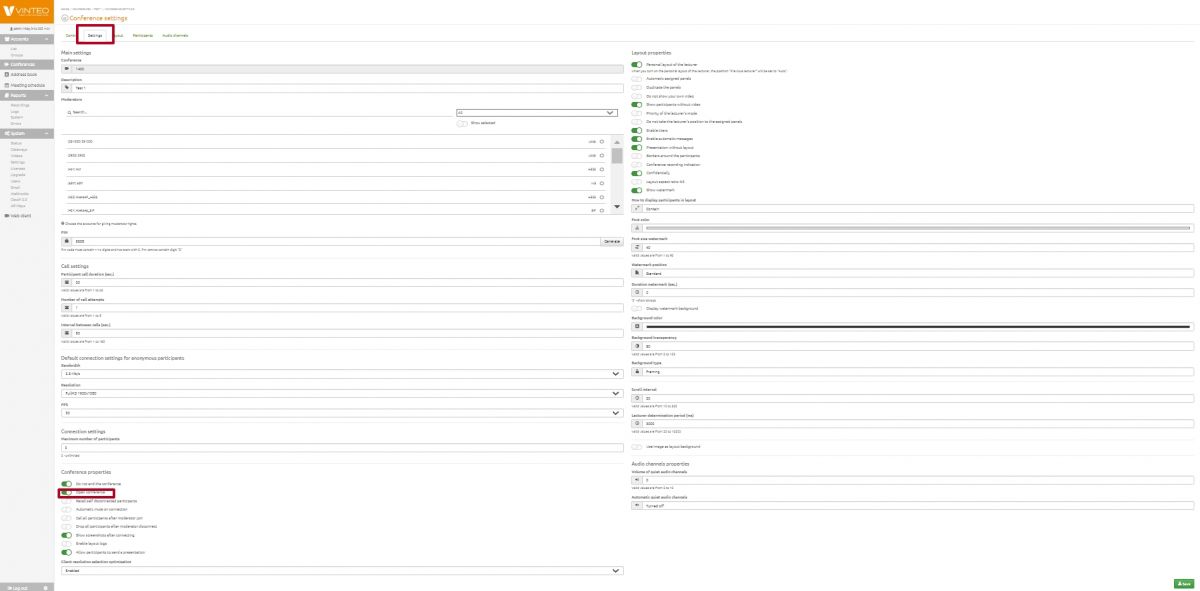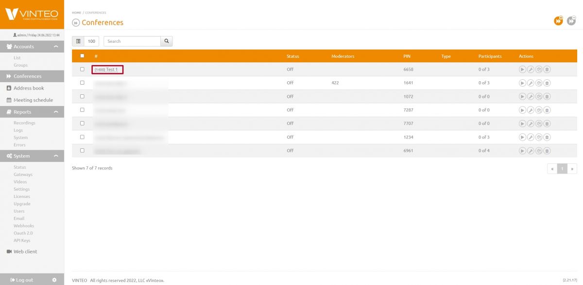 Go to the conference settings by clicking on the «(1000) Test» line in the conference list.