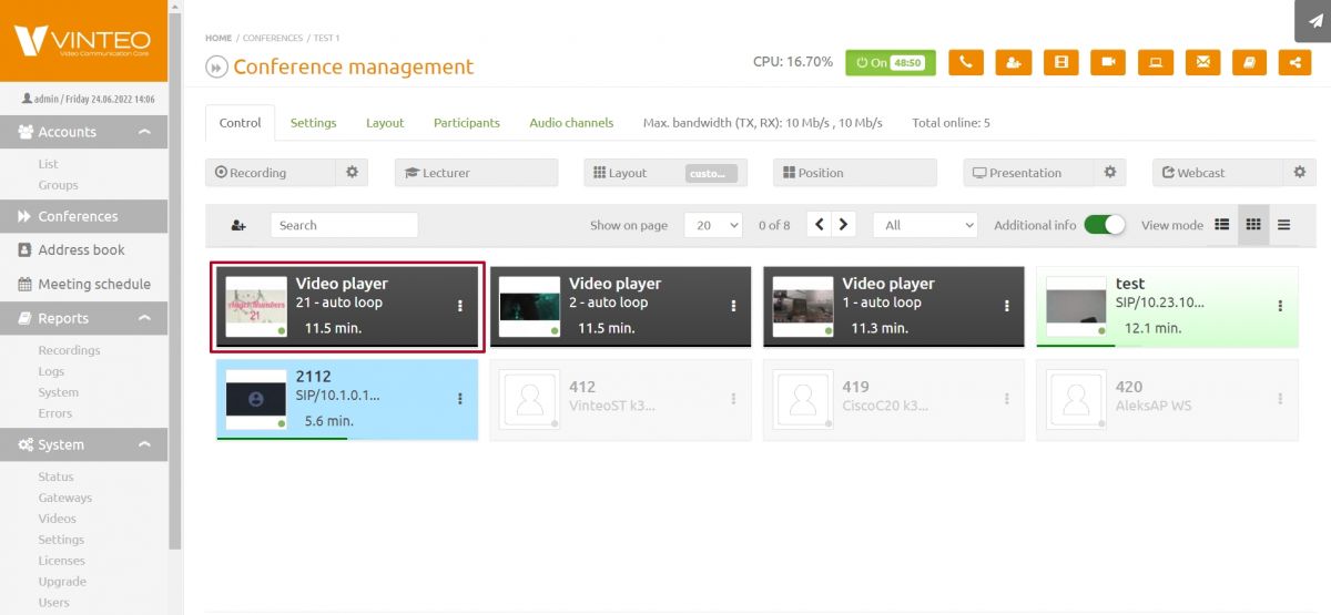 To call registered subscribers from the server, enter the created conference: «Home» => «Conferences» => line in the list «(1000) Test».