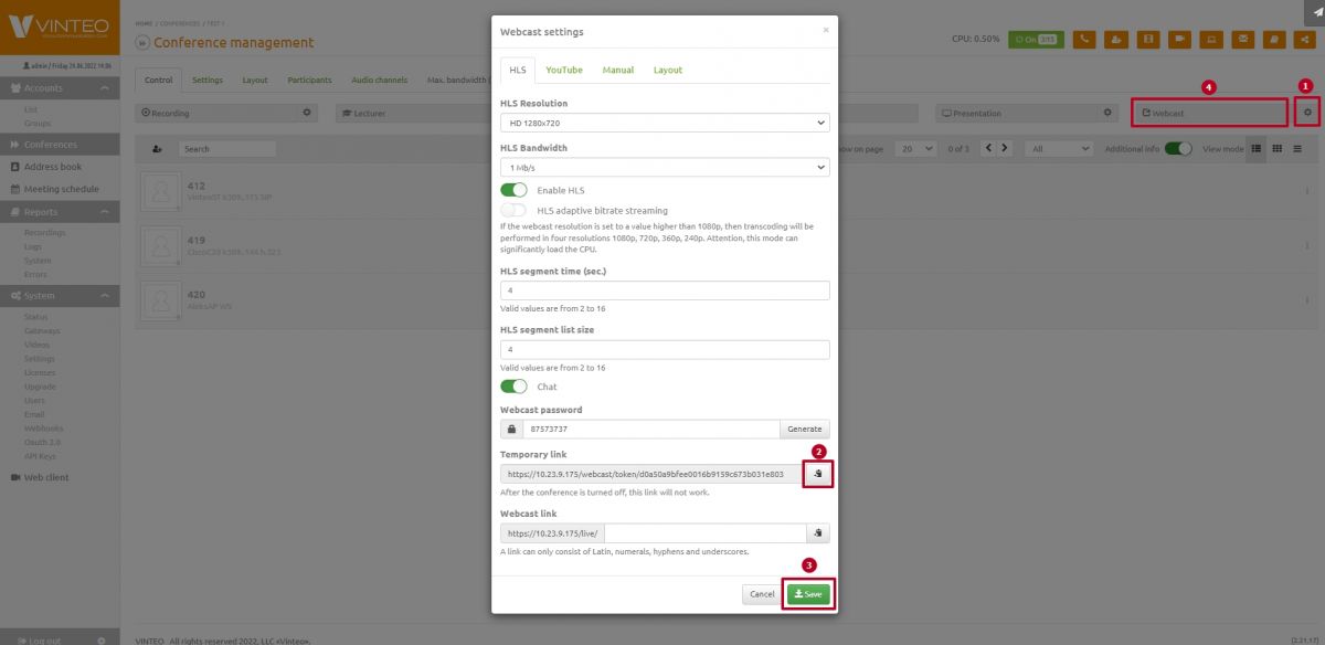 - Enter the Webcast settings from the «Conference Management» page;