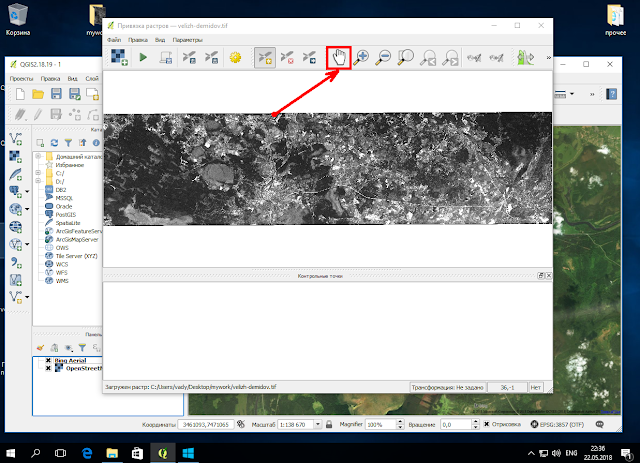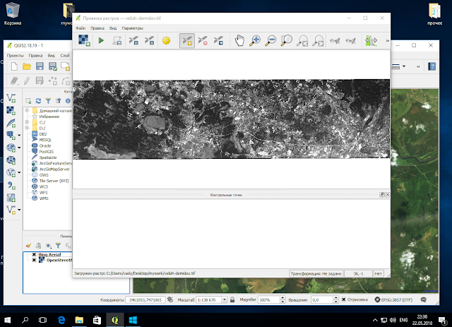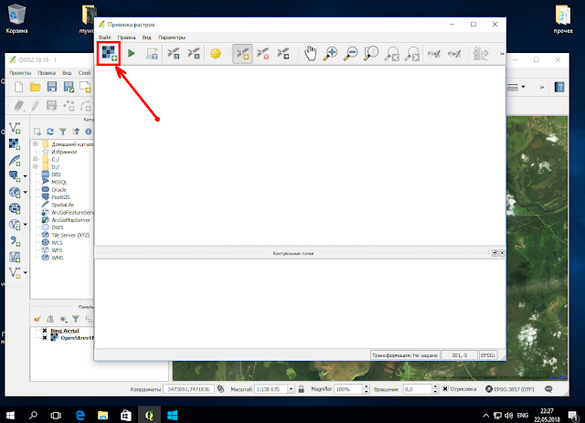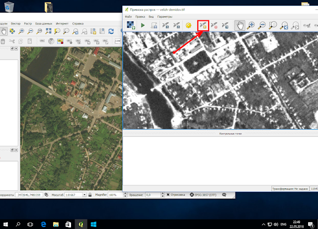 Переходим к нужным точкам нашего снимка, которые имеют что-то общее с снимком Bing. Это будут т.н. опорные точки. Как минимум, 4 опорные точки в разных местах расставляем. Для начала расположим окна нашей программы поудобнее, чтобы найти общие места под опорные точки.