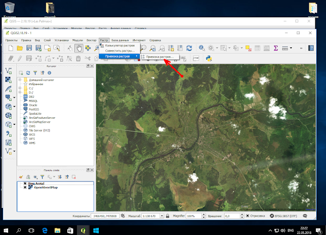 Начинаем добавление снимка поверх карты Bing: Растр ->Привязка растров ->Привязка растров.