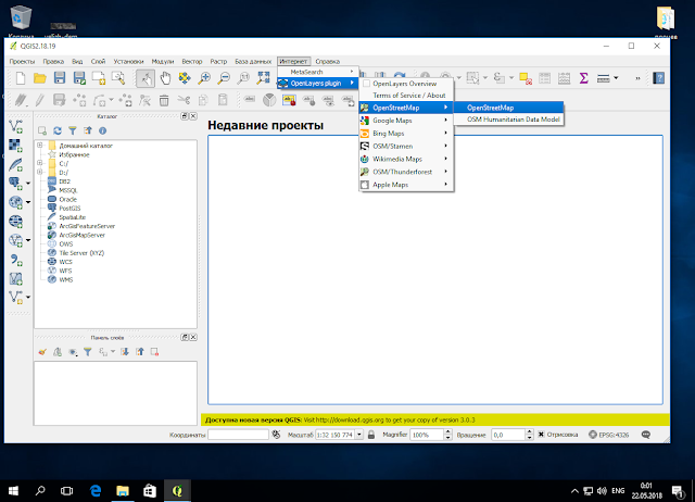 Добавим к нашему проекту слой OpenStreetMap (Интернет -> OpenLayer`s plugin -> OpenStreetMap — OpenStreetMap):