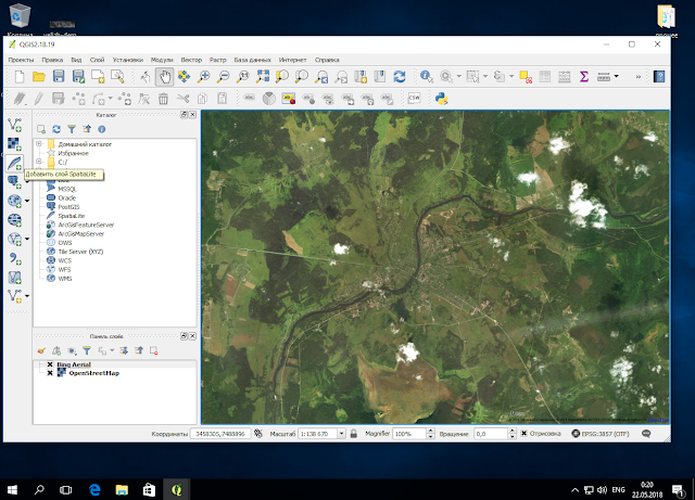 Обращаем внимание на Панель слоёв (в нижнем левом углу программы). Видим два слоя, слой Bing Aerial находится над слоём OpenStreetMap. Можно перемещать слои, можно отключить/включить.