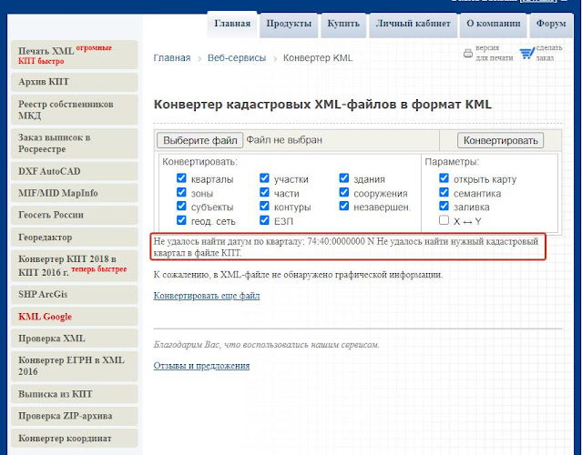 Конвертация в KML для просмотра Google Earth невозможна на данный момент по одной простой причине — файлы выписок больше не содержат информации о используемой в них системе координат (СК). О чем нас конвертер честно уведомляет: