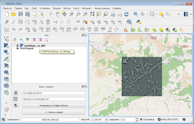 В QGIS открываем: меню «Слой» → «Добавить слой» → «Добавить растровый слой» или жмем ++, выбираем созданный файл изображения. При открытии информация про географическую привязку изображения считывается из вспомогательных файлов автоматически.