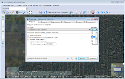 В открывшемся окне выбираем нужный масштаб (в примере – 15) и тип карты (по умолчанию выбран такой же как отображаемый в данный момент), нажимаем [Начать].