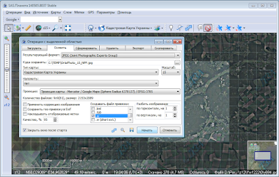 В появившемся окне «Операции с выделенной областью» переходим на вкладку «Склеить». Выбираем результирующий формат JPEG, путь куда сохранять склеенное изображение, тип карты (в нашем случае – Кадастровая карта Украины), зум (он же масштаб), создать файл привязки «.W». Остальные все параметры оставляем по умолчанию (как на скриншоте). нажимаем [Начать].
