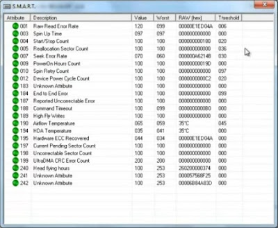 Давайте нажмем на нее и посмотрим, что получиться. Не будем вдаваться в подробности главное, что бы все показанные атрибуты были зеленого цвета, если же это не так необходимо разобраться с этими атрибутами, как уже писалось выше Вы можете ознакомиться с ними перейдя по ссылке аттрибуты S.M.A.R.T. Для того что бы их посмотреть нет необходимости, что то запускать просто нажимаем на кнопку «SMART» и все представлено на экране.