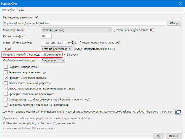 1. Если у вас еще не включен вывод сообщений при компиляции скетчей, то перейдите в окно настроек IDE Arduino и установите соответствующую опцию: