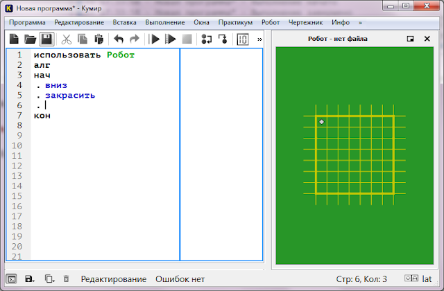 Чтобы Кумир понимал, с каким именно исполнителем вы будете работать, необходимо прежде всего выбрать команду » Вставка — использовать Робот «.