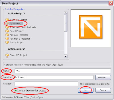В появившемся окне выбираем «AS3 Project», в поле «Name» пишем имя проекта, в поле «Location» указываем директорию, поле «Package» оставляем пустым, ставим галочку «Create directory for project», для того чтобы создать одноименную директорию для проекта, жмем «OK».