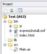 Справа во вкладке «Project» вы увидите директорию вашего проекта. В нее входят директория «bin» с исполняемыми файлами (результирующим .swf-файлом и примером HTML-страницы с Javascript-объвязкой), «lib» — библиотека проекта и «src» — директория c исходными кодами.