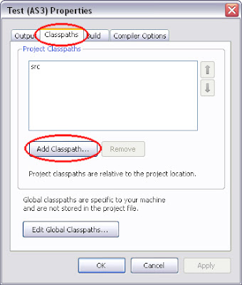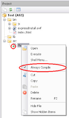 По умолчанию в директорию «src» входит файл «Main.as». Иконка файла в левом нижнем углу помечена зеленой стрелкой вниз. Это означает, что этот класс является родительным классом всего приложения. Компиляция .swf начнется именно с него. Нажав правой кнопкой на этом файле, затем выбрав пункт «Always Compile» в выпадающем меню, можно снять эту отметку, и поставить ее на другой файл.