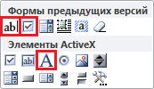 Так как мы сохранили шаблон в старом формате 97-2003, вам будут доступны только формы предыдущих версий. В группе «Элементы управления», найдите и нажмите кнопку «Инструменты из предыдущих версий». В выпадающем меню вам будет предложен ряд блоков, доступных для вашего шаблона.