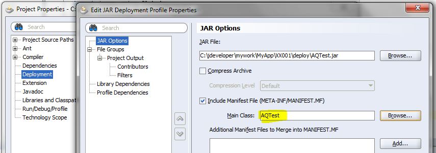 В появившемся окне указываем местоположение будущего jar-файла и имя класса, содержащего процедуру main. Это имя подставится в автоматически создаваемый файл метаданных MANIFEST.MF. Таким образом, при выполнение скомпонованного файла начнется с метода AQTest.main():