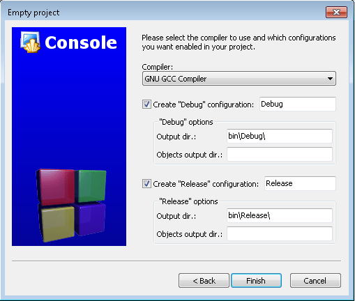 тут нам необходимо указать имя файла (я назвал main) и его путь, желательно папку с проектом. Ставим галочки на Debug и Release и кликаем Finish.