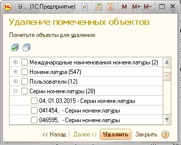 Если вам нужно удалить не все помеченные в 1С 8.3 объекты, то выбирайте второй вариант: «Выборочное удаление». В таком случае кнопка «Удалить» превратится в кнопку «Далее», по нажатию на которую программа найдет все помеченные на удаление объекты в базе 1С 8.3 и покажет вам их список. Удалять все или нет, вы можете выбрать сами, установив/сняв галочки напротив нужных объектов.