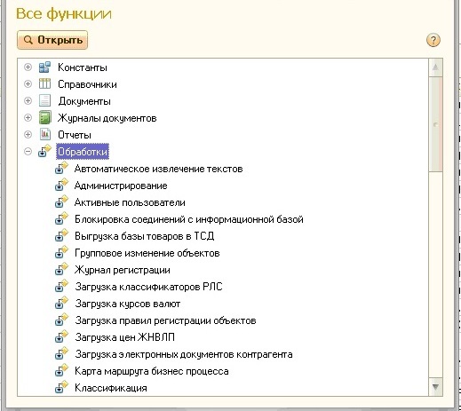 В нем выбираете строку «Обработки». Откроется как видите очень много, даже в экран не лезет.