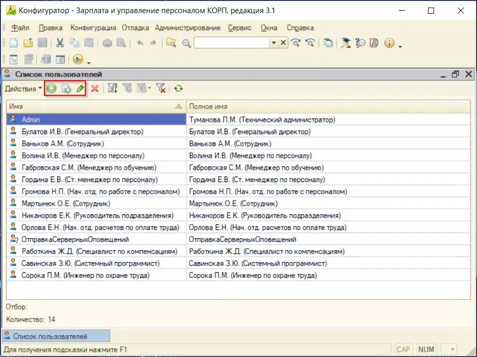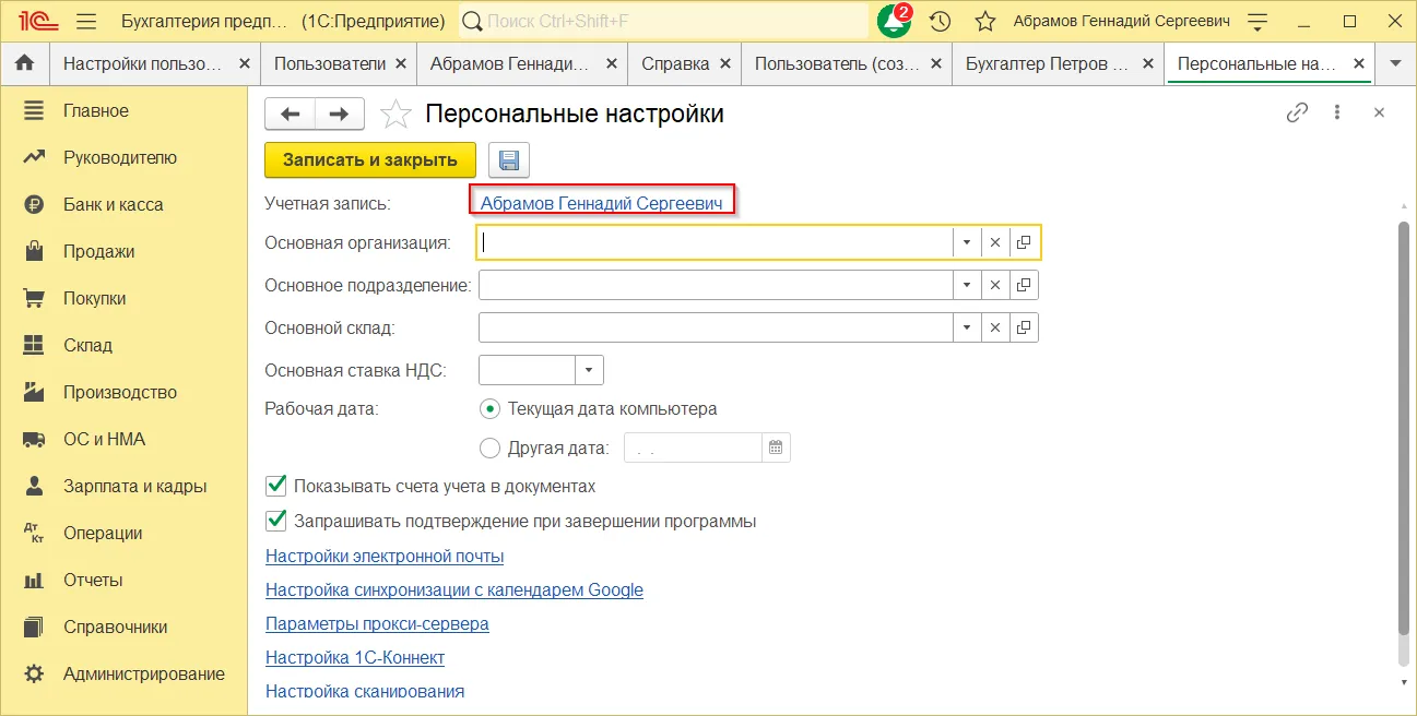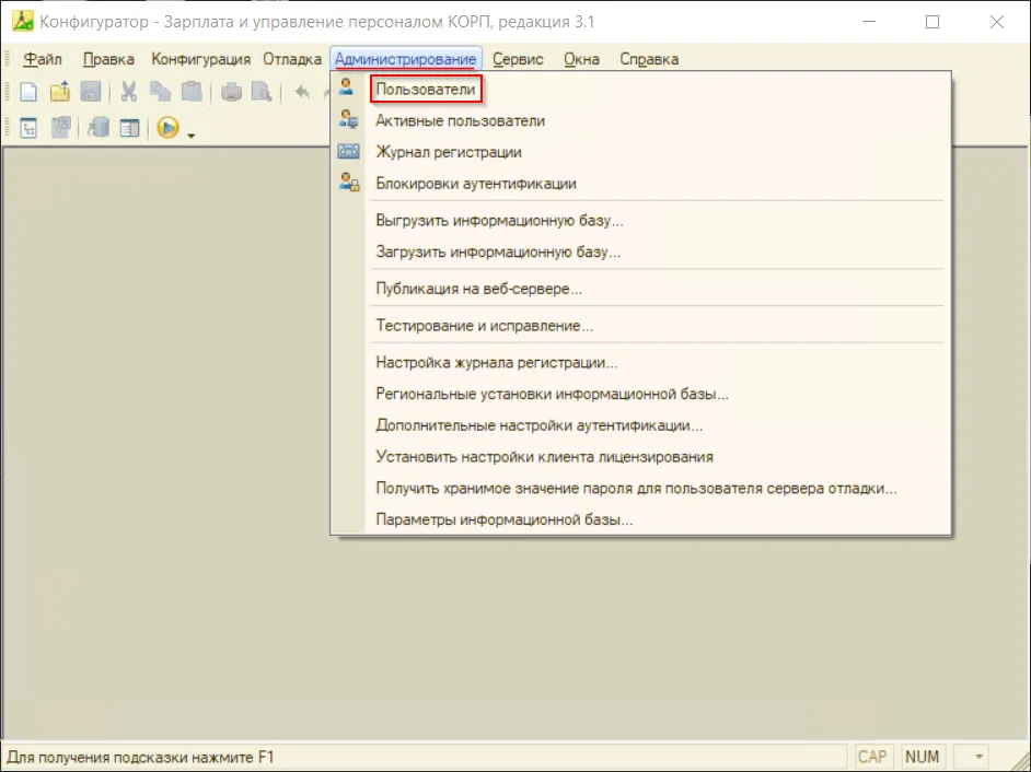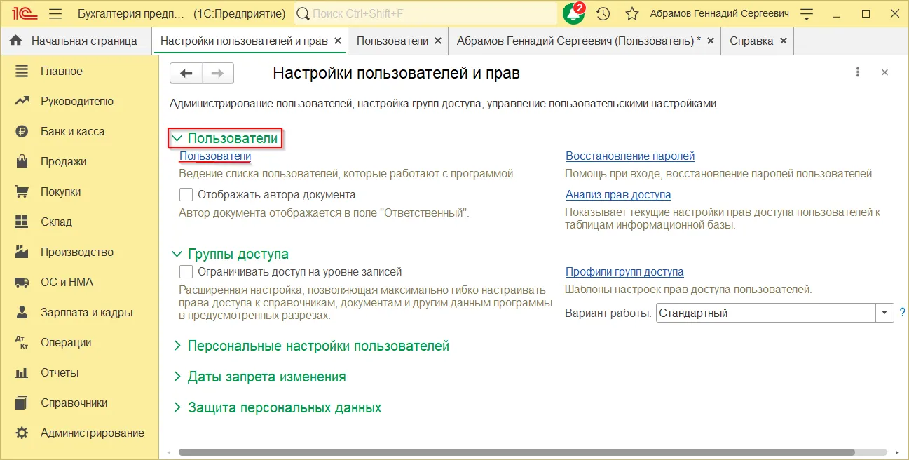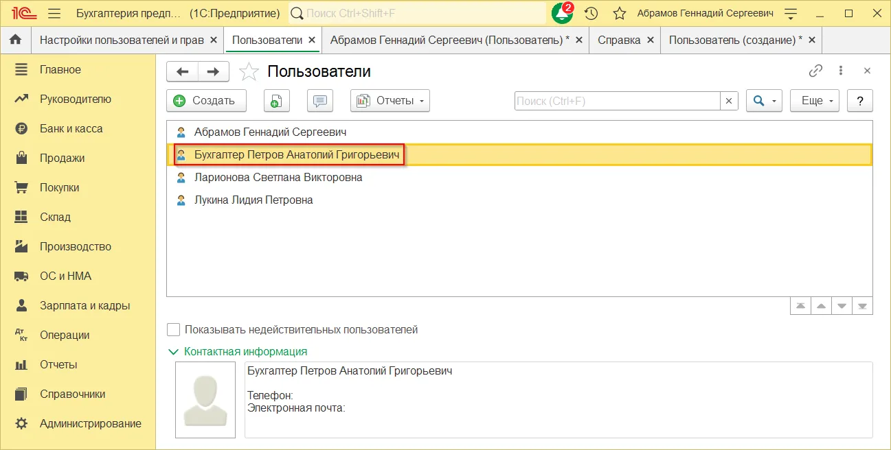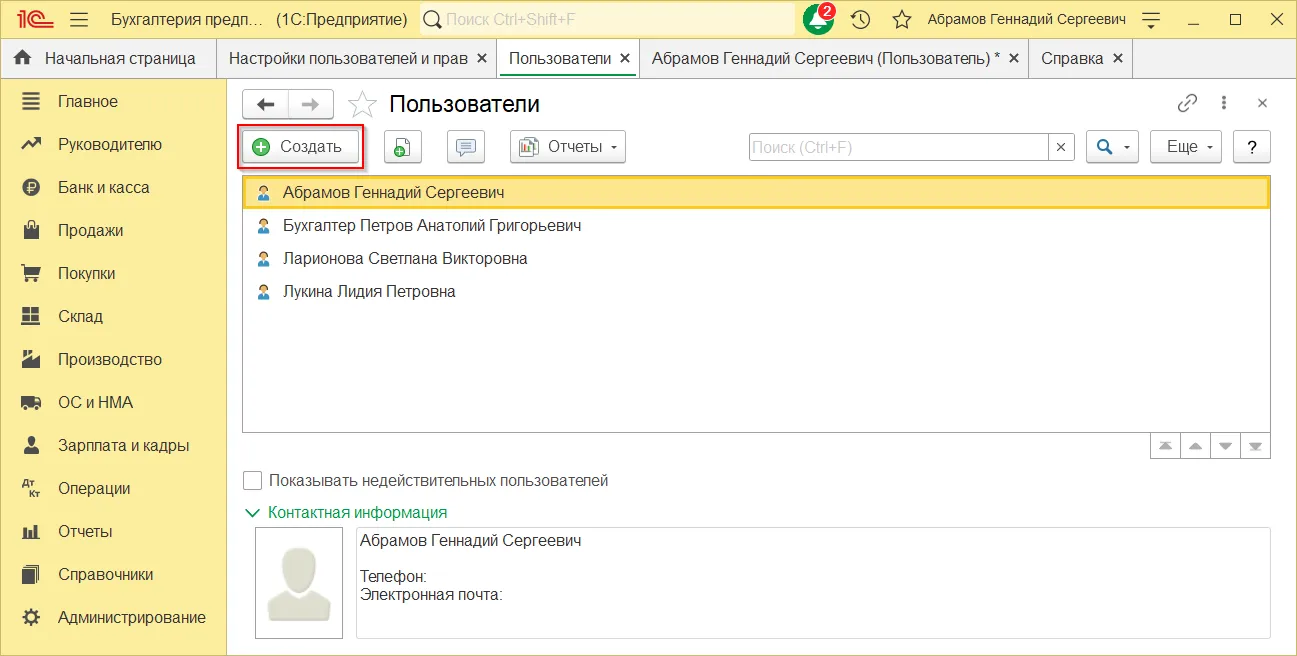 После этого раздел «Пользователи» будет доступен в 1С.