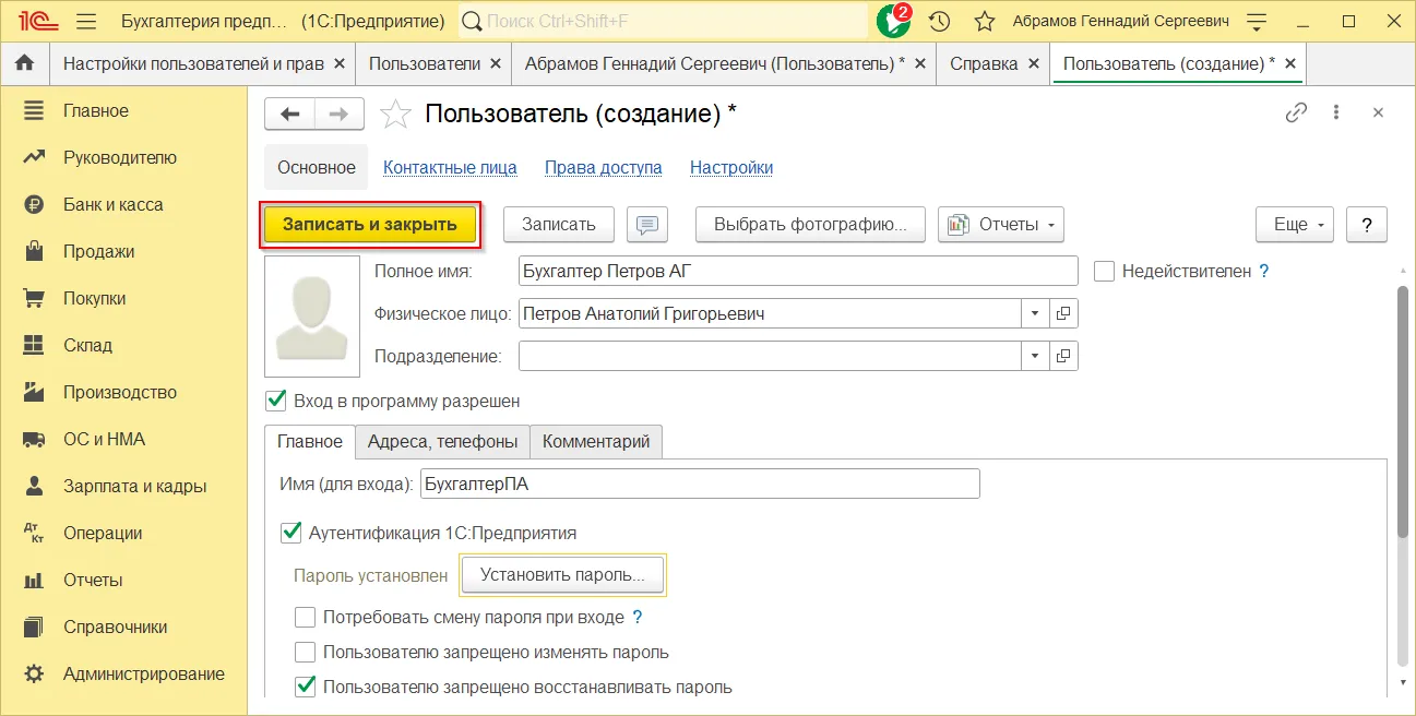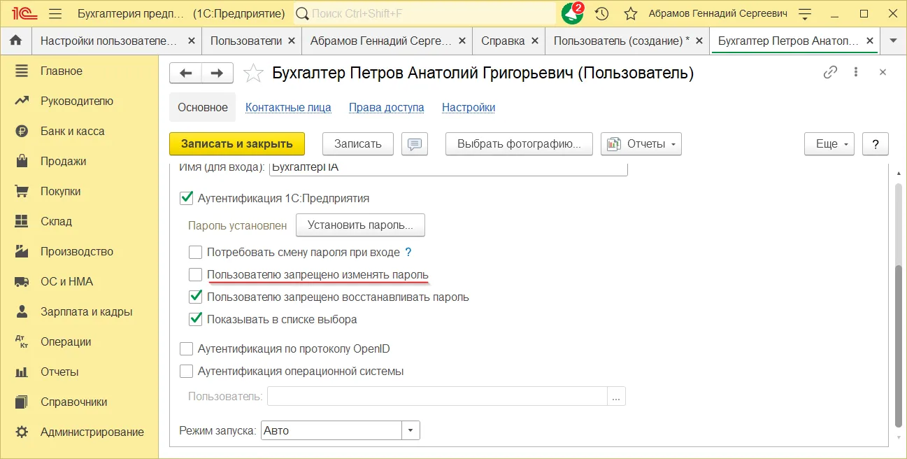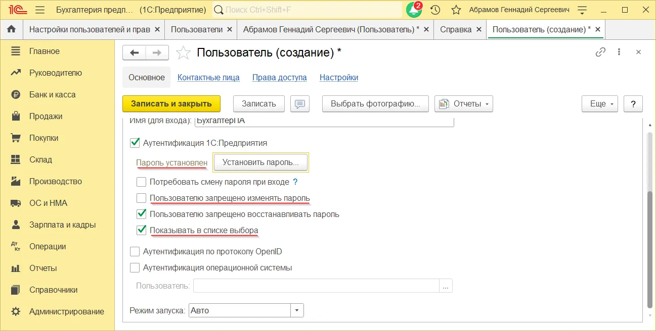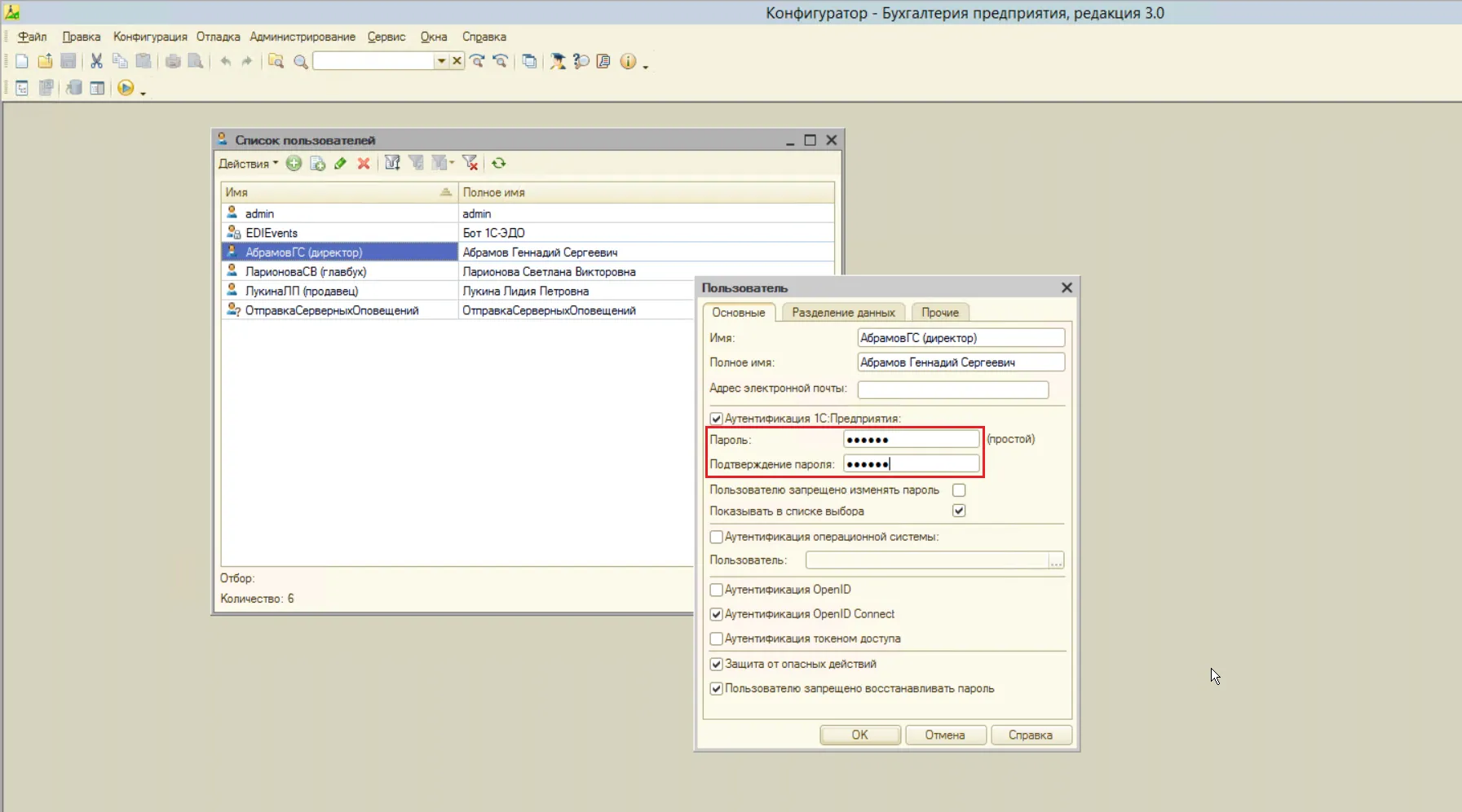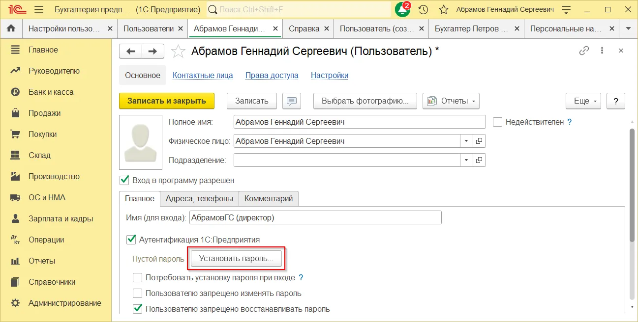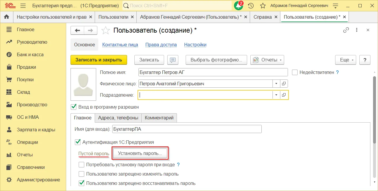 Как установить пароль пользователя в 1С:Бухгалтерии 3.0