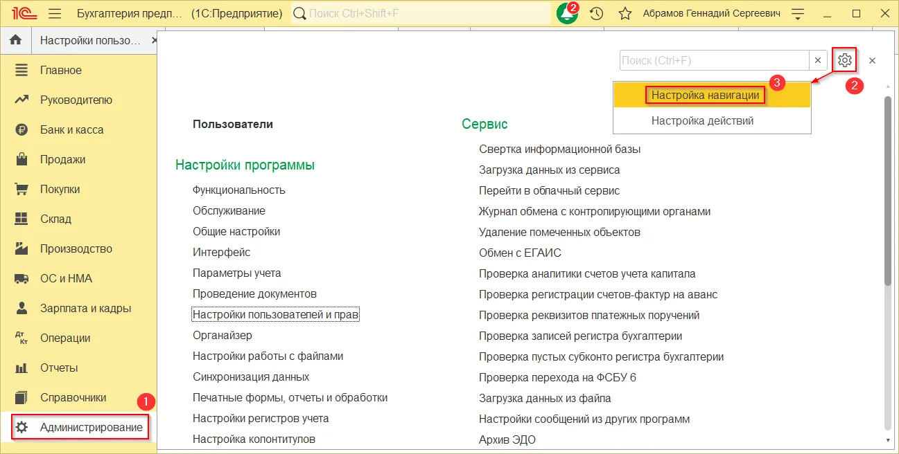 Это можно исправить в настройках. Для этого снова переходим в раздел «Администрирование», затем в правом верхнем углу нажимаем на «шестеренку» → «Настройка навигации».