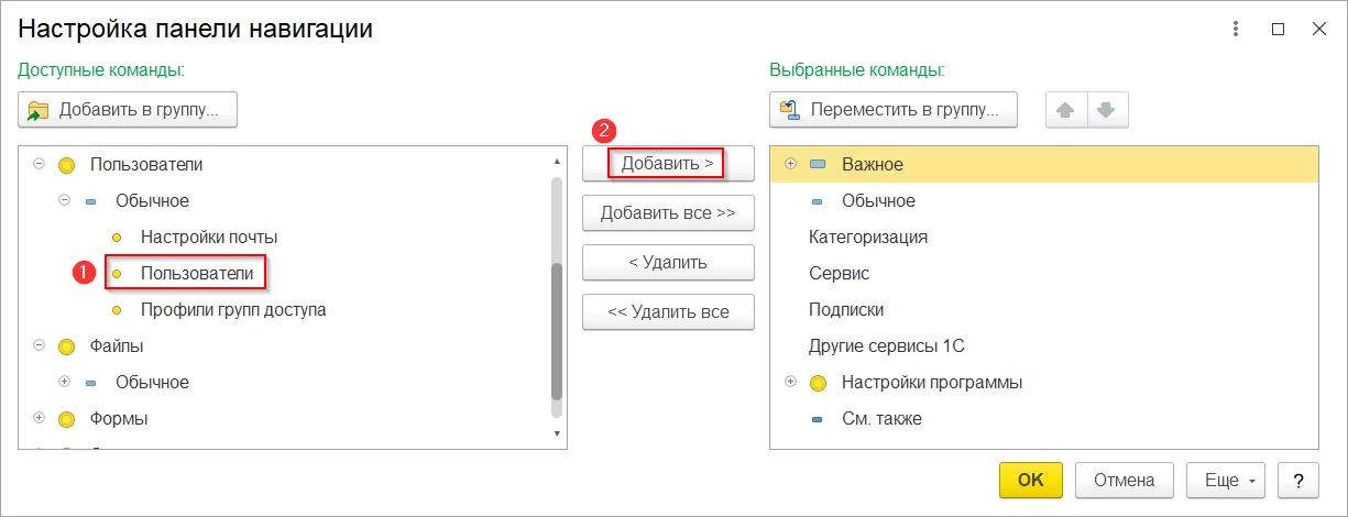 В левой колонке выбираем «Пользователи» и переносим эту строку в правую часть экрана, нажав на кнопку «Добавить».