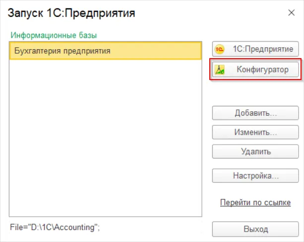 Откройте программу 1С в режиме Конфигуратора, это можно сделать в окне запуска.