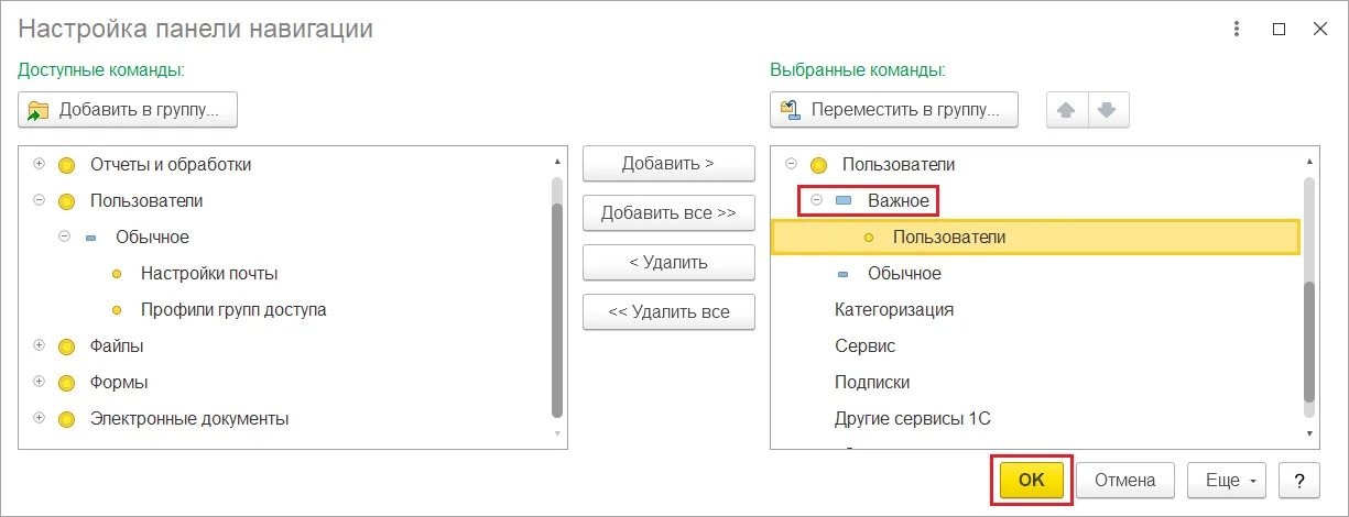 После этого перемещаем «Пользователи» в «Важное». Сохраняем настройки нажатием на «Ок».