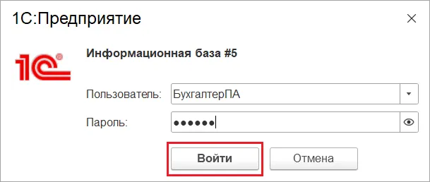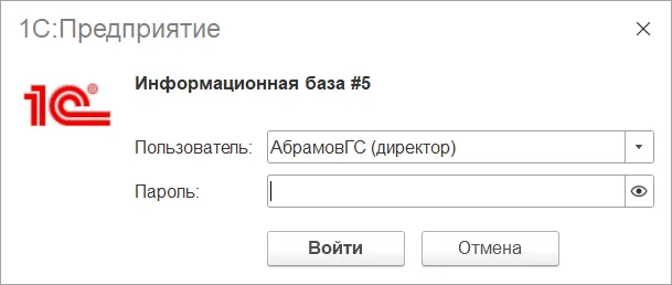После этого необходимо перезайти в 1С, выбрать имя пользователя и ввести пароль.