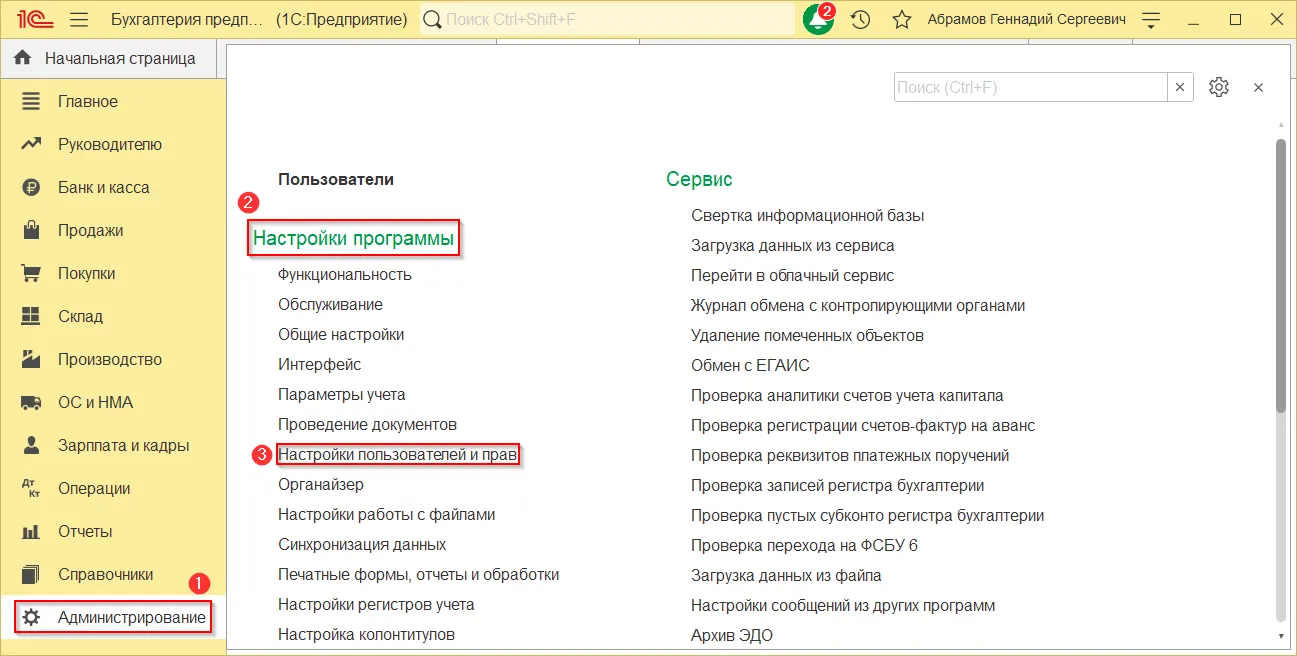 Нужно перейти в раздел «Администрирование» → «Настройки программы» → «Настройки пользователей и прав».