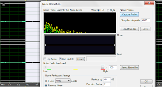 1) Сначала нужно найти на звуковой дорожке фрагмент, содержащий только шумы. Его нужно выделить мышью и выбрать Effects -> Restoration -> Noise Reduction