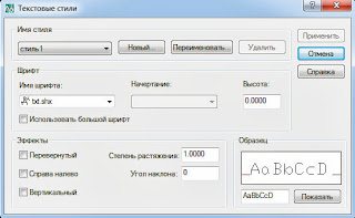 2) В списке Шрифт установите шрифт, какой вам по душе. В поле Высота введите значение 0. Это необходимо сделать для того, чтобы в случае ввода текста указывать предварительно высоту символов каждый раз. В диалоговом окне можно задать Угол наклона ( Oblique Angle ) . И указать Степень растяжения ( Width Factor )
