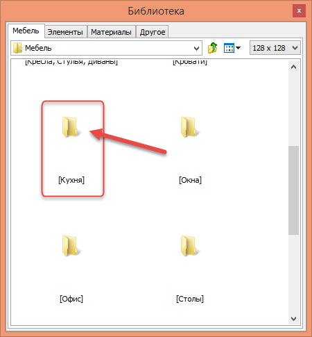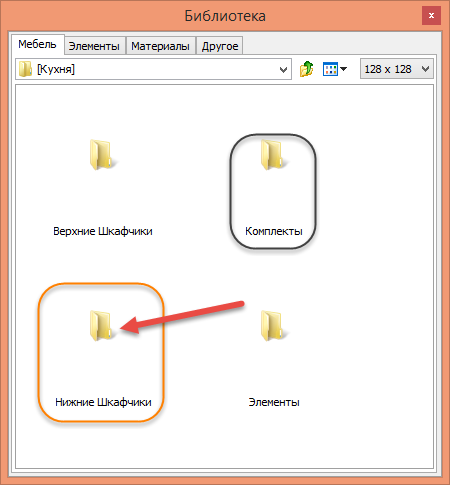 Находим в открывшемся окне программы, кнопку «библиотека». Жмем ее и в появившемся окне выбираем папку «кухня». В этой папке, открываем папку «нижние шкафы». Выбираем шкаф и перетаскиваем его в рабочее пространство программы. Можно выбрать и, комплекты (верхние и нижние шкафы), но лучше начать разбор полетов с простого.