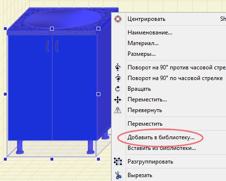 Добавляем наш шкаф в библиотеку, чтобы в следующий раз нам не пришлось делать все заново. Для этого, выделяем шкаф, жмем правой кнопкой мыши в любом месте рабочей зоны. В открывшемся окне, жмем добавить в библиотеку, в следующем открывшемся окне выбираем в какую папку добавить и как назвать.