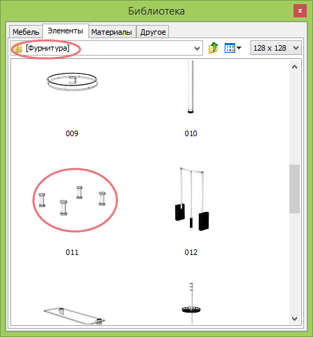 Теперь нам нужно добавить ножки к нашей тумбочке, ведь не будет же она висеть в воздухе). Для этого, заходим в библиотеку, находим вкладку элементы , в ней находим папку фурнитура и в ней находим наши ножки.