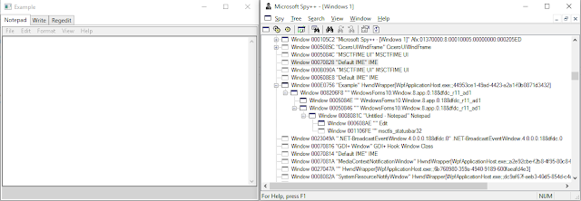 Казалось бы, почему бы не сделать все то же самое, но без WindowsFormsHost? Добавить обычный WPF UserControl и попытаться на нём разместить приложение, но тут нас ждёт разочарование. Все UI элементы в WPF наследуются от класса Visual и не имеют Win32 Handle окна, а значит редерингом окна занимается не Windows, а внутренние механизмы WPF. В этом можно убедиться, запустив Spy++ (Утилита идущая с Visual Studio и являющаяся аналогом Snoop, но для Win32 приложений), и нацелив на окна приложений написанных на WPF и Win32. Мы увидим следующее: