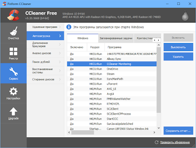 После этого переходим в раздел Автозагрузка и удаляем все подозрительные пункты в этом списке, выделив его и нажав кнопку Удалить. Но лучше, если вы сомневаетесь в каком-то пункте или боитесь удалить что-то нужное, вместо кнопки Удалить нажмите Выключить. В этом случае вы всегда сможете включить назад ошибочно отключённый пункт, а удалить можно будет и потом, когда убедитесь, что всё сделали правильно.