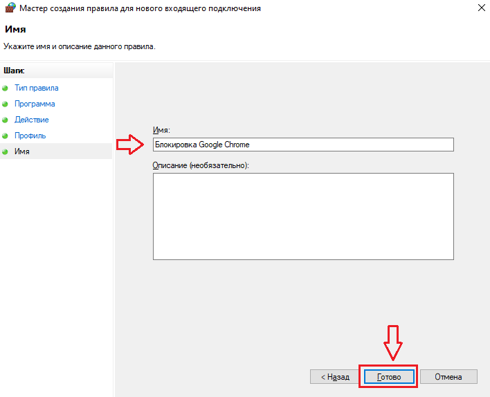 В окне «Имя», указываем имя создаваемого правила брандмауэра и нажимаем «Готово»: